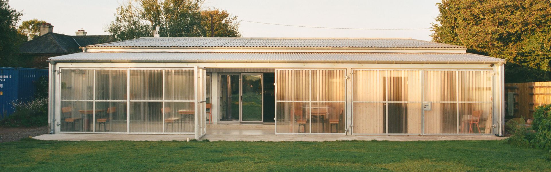 The building is part of a rural community development in South Devon which looks to add to the area’s social and economic life. It sits amongst a two-acre plot which has space for skateboarding, small-scale farming, and play areas, hosting a cafe, event space, ceramics studio and surfboard shaping workshop. Sited in a designated Area of Outstanding Natural Beauty, where near-barren arable monocultures are often preferred over mixed use regenerative practices, the project serves as a case study for new forms of hyperlocal, sustainable rural development.