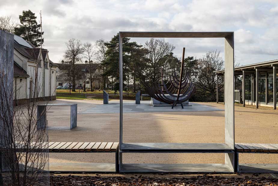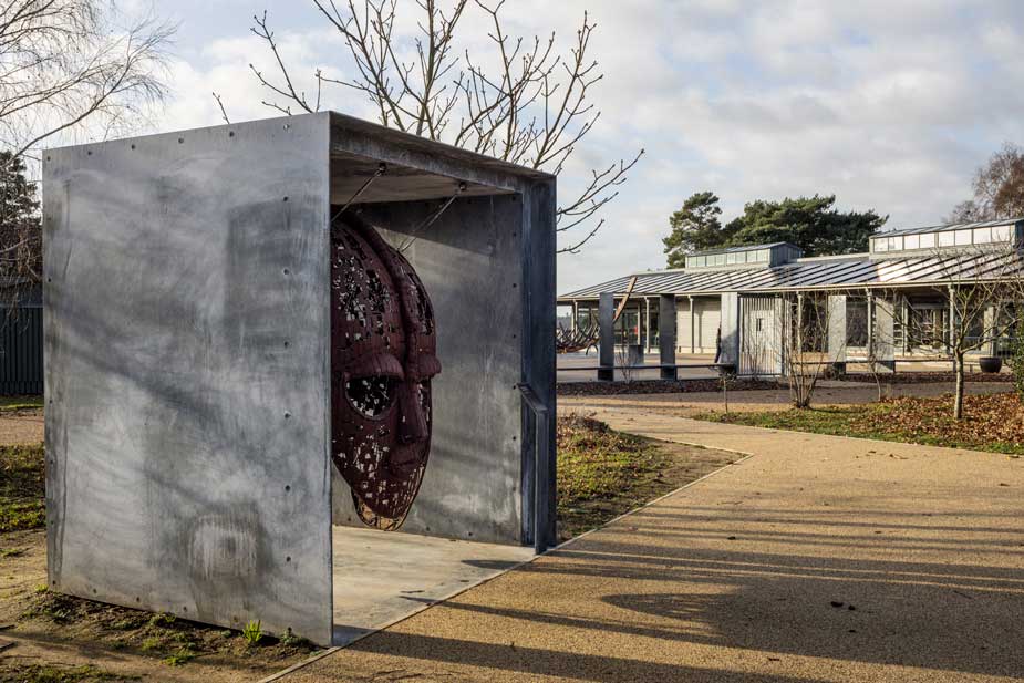 Galvanised steel was also used at the entrance to the visitor attraction, in the form of a frame around a giant representation of the burial mask originally found at the site, a new entrance portal to the arrival building and the seats and framework with linked portals that frame the entrance courtyard.