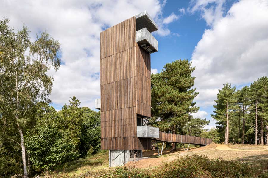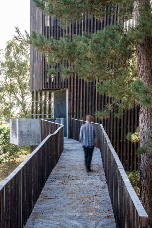 The tower, signifying a contemplative end to the experience, is made up of a semi-permeable, charred timber clad structure, wrapped around a galvanized steel frame. At the heart of the process was the need to minimise the disturbance to the fragile archaeological layers beneath the surface of the tower, which ultimately led to the use of a highly efficient steel structure with a minimal footprint. The charred larch skin is left unsealed to soften over time, merging with the surrounding woodland.